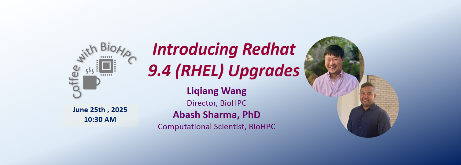 Join us for a special Coffee with BioHPC session as we dive into the Red Hat Enterprise Linux 9.4 (RHEL 9.4) upgrade. Whether you're a seasoned user or just getting started with BioHPC systems, this is your chance to stay ahead of the curve and get hands-on insights from our in-house experts who will walk you through what’s changing, how it may affect your workflows, and what support you can expect during this migration.